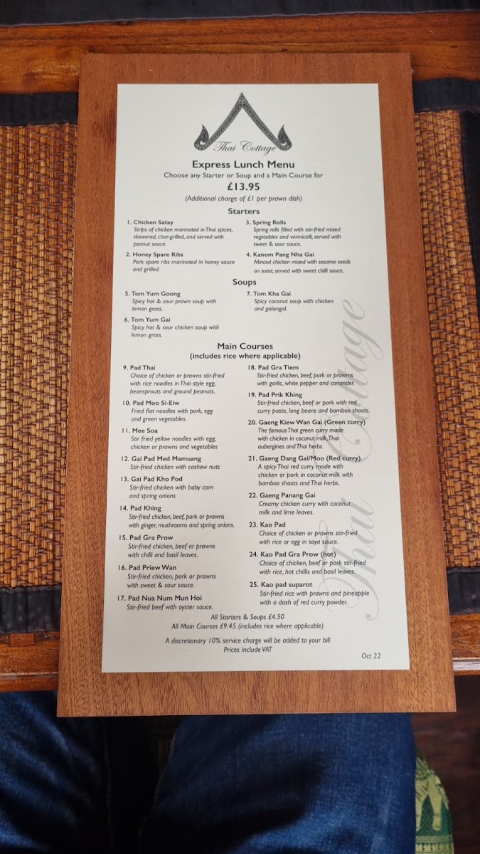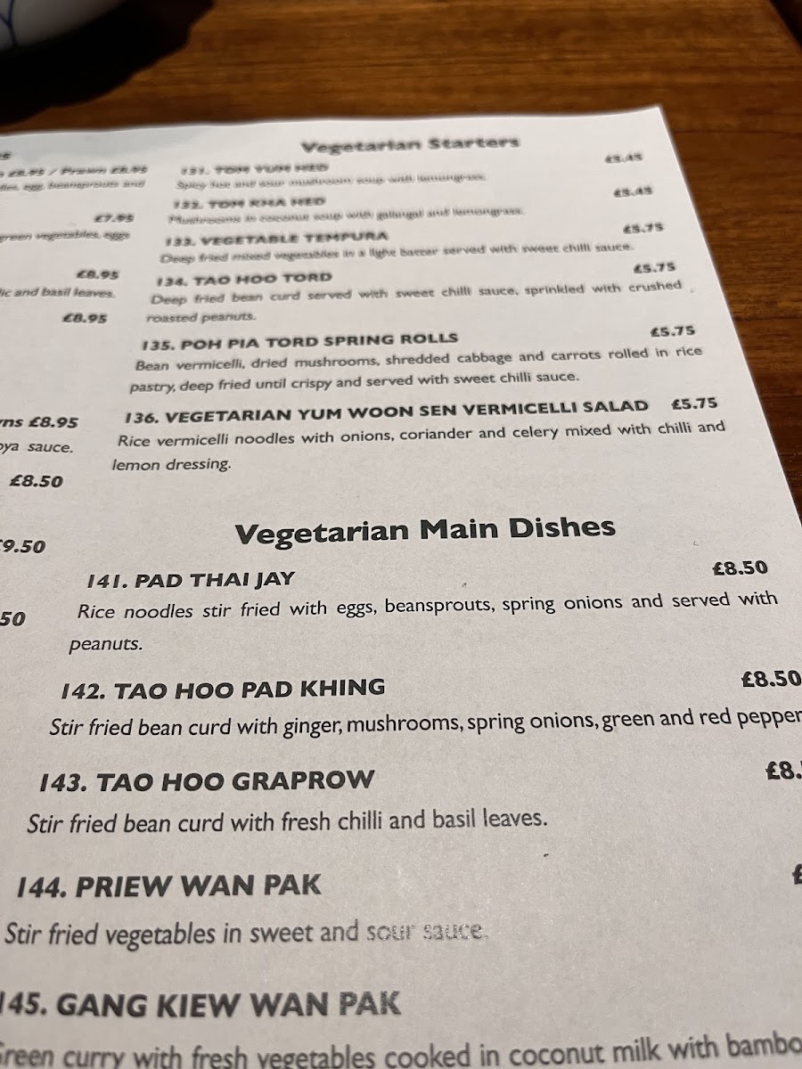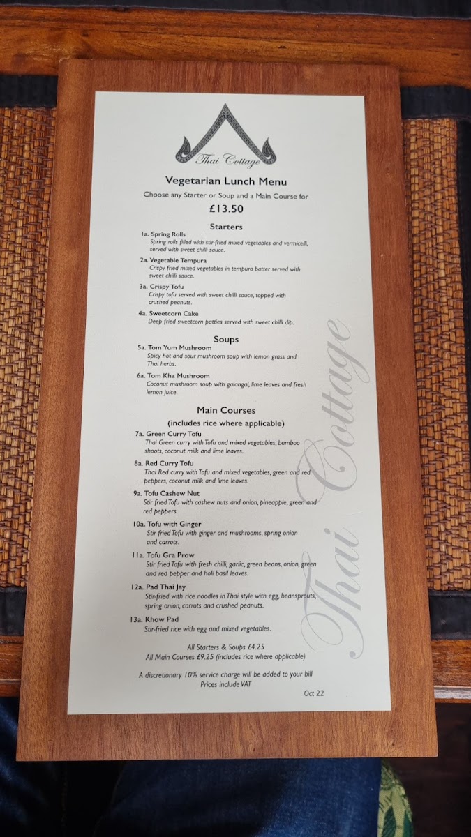 Dining at Thai Cottage on 149 High St, Berkhamsted, offers a menu that balances traditional Thai flavors with thoughtful variety. The starters set the tone with options like Chicken Satay and Honey Spare Ribs, alongside the aromatic soups Tom Yum Goong and Tom Yum Gai, promising a warm, flavorful beginning. Main courses continue this appeal with dishes such as Pad Moo Si-Eiw, Pad Thai, Mee Soa Gai Pad Med Mamuang, and Gai Pad Kho Pod, each showcasing the restaurant’s skill in blending textures and spices. For those seeking lighter or plant-based options, the vegetarian selection is equally compelling. Starters like Vegetable Tempura, Poh Pia Tord Spring Rolls, and Vegetarian Yum Woon Sen Vermicelli Salad provide fresh, crisp flavors, while mains such as Pad Thai Jay, Tao Hoo Graprow, Tao Hoo Pad Khing Priew Wan Pak, and Gang Kiew Wan Pak highlight the depth of Thai vegetarian cuisine. Across the menu, the dishes are presented with care, offering both familiar favorites and less-common choices, making it easy for diners to explore a variety of tastes. Overall, Thai Cottage’s menu delivers a comprehensive Thai experience, from starters to mains, satisfying both meat-eaters and vegetarians alike with its thoughtfully curated selection.
